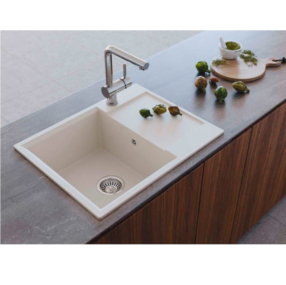 Мойка кухонная Omoikiri из коллекции Daisen 65-BE имеет размеры 650х510 мм., изготовлена из искусственного гранита. Форма — прямоугольная, одна чаша без отверстия для смесителя. Сифон в комплекте. Ширина чаши 36. Врезной монтаж. Имеется крыло.