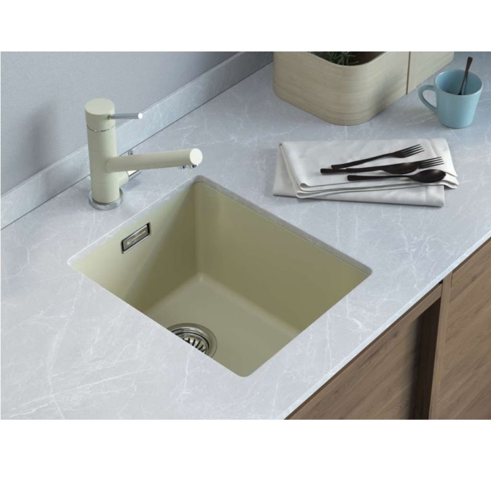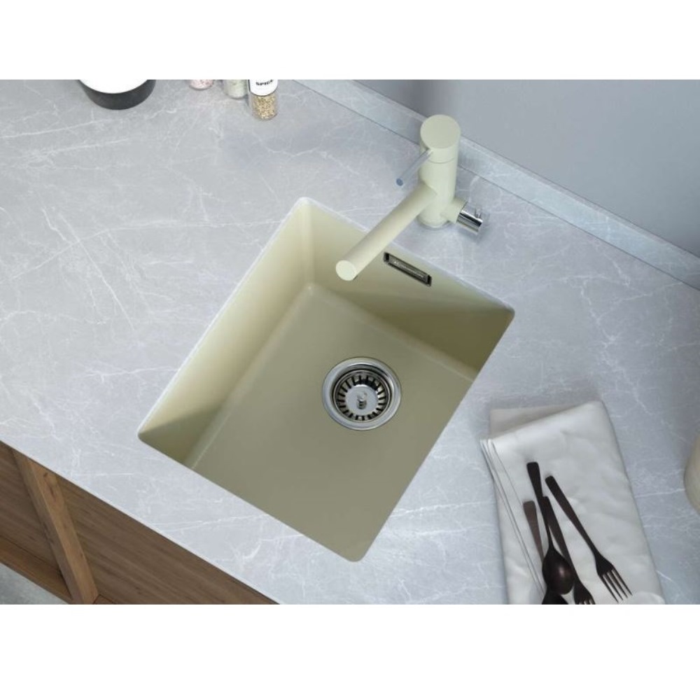 Мойка кухонная Omoikiri из коллекции Kata 34-U-PA имеет размеры 340х420 мм., изготовлена из искусственного гранита. Форма — прямоугольная, одна чаша без отверстия для смесителя. Сифон в комплекте. Ширина чаши 30. Подстольный монтаж