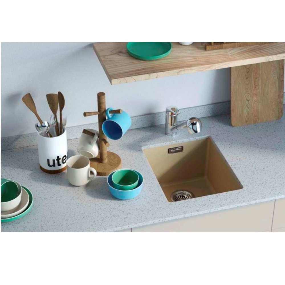Мойка кухонная Omoikiri из коллекции Kata 34-U-GR имеет размеры 340х420 мм., изготовлена из искусственного гранита. Форма — прямоугольная, одна чаша без отверстия для смесителя. Сифон в комплекте. Ширина чаши 30. Подстольный монтаж