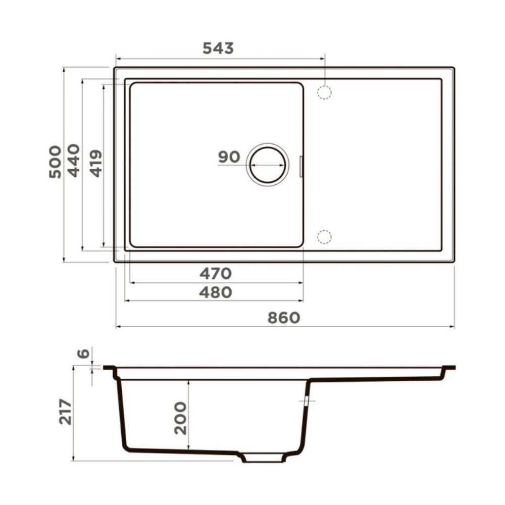 Мойка кухонная Omoikiri из коллекции Sintesi 86-CN имеет размеры 860х500 мм., изготовлена из искусственной керамики. Форма — прямоугольная, одна чаша без отверстия для смесителя. Сифон в комплекте. Ширина чаши 47. Врезной монтаж. Имеется крыло.