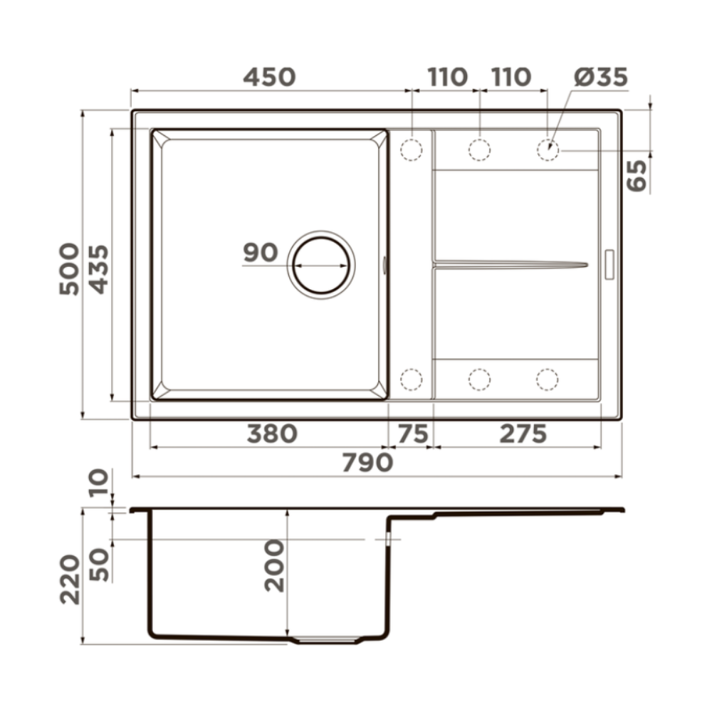Мойка кухонная Omoikiri из коллекции Sumi 79-PL имеет размеры 790х500 мм., изготовлена из искусственного гранита. Форма — прямоугольная, одна чаша без отверстия для смесителя. Сифон в комплекте. Ширина чаши 38. Врезной монтаж. Имеется крыло.