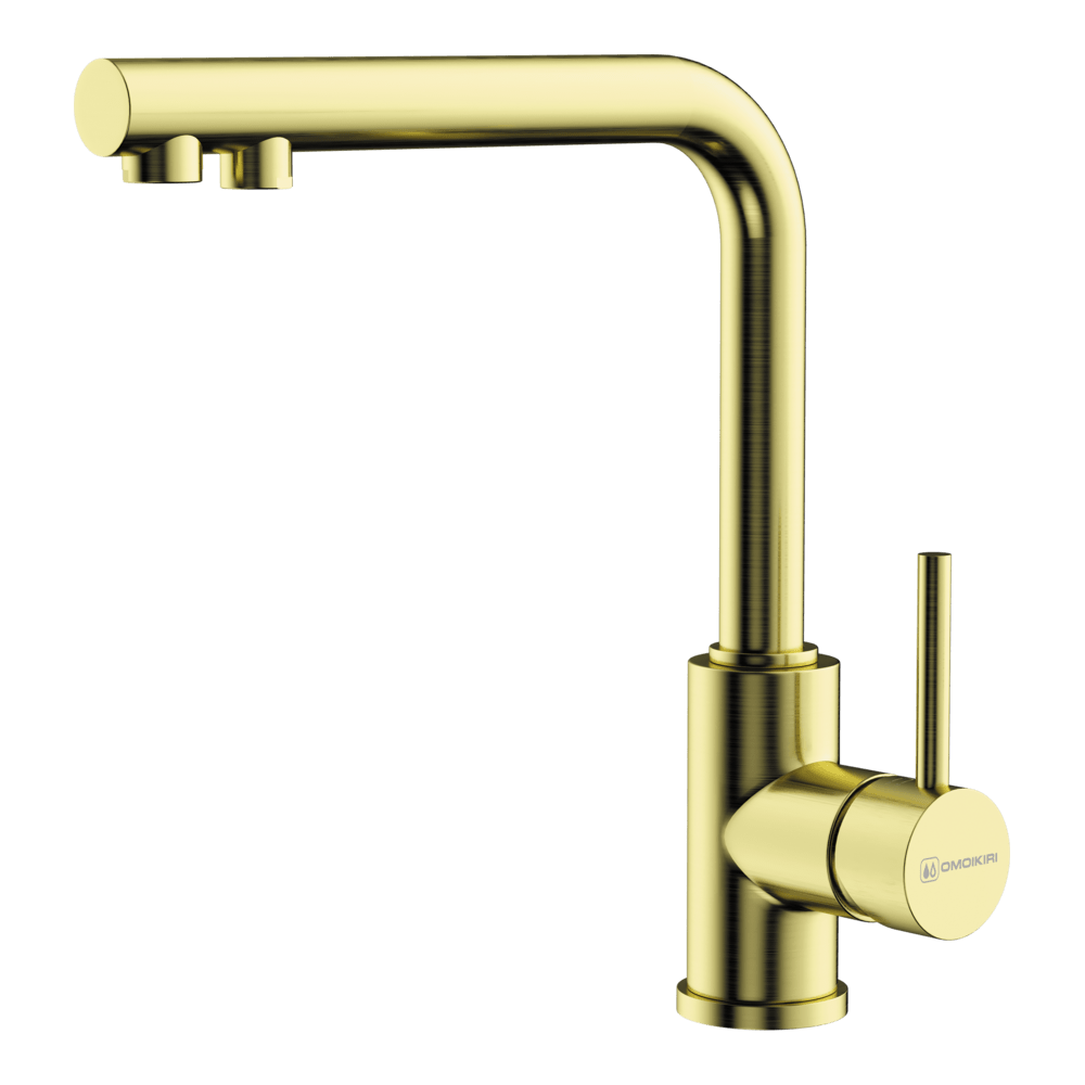 Смеситель для кухни Omoikiri Nakagawa 2 Plus с подключением фильтра оснащен рычажным управлением для регулировки температуры и напора воды. Горизонтальный монтаж на 1 отверстие. Поворотный излив 210 мм.